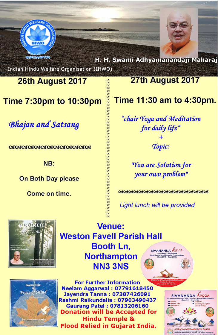 H. H. Swami Adhyamanandaji Maharaj Weston Favell Parish Hall Booth Lane Northampton NN3 3NS 26 – 27 August 2017 87 Post navigation Gujarati School Sports Day Holi Festival 2018